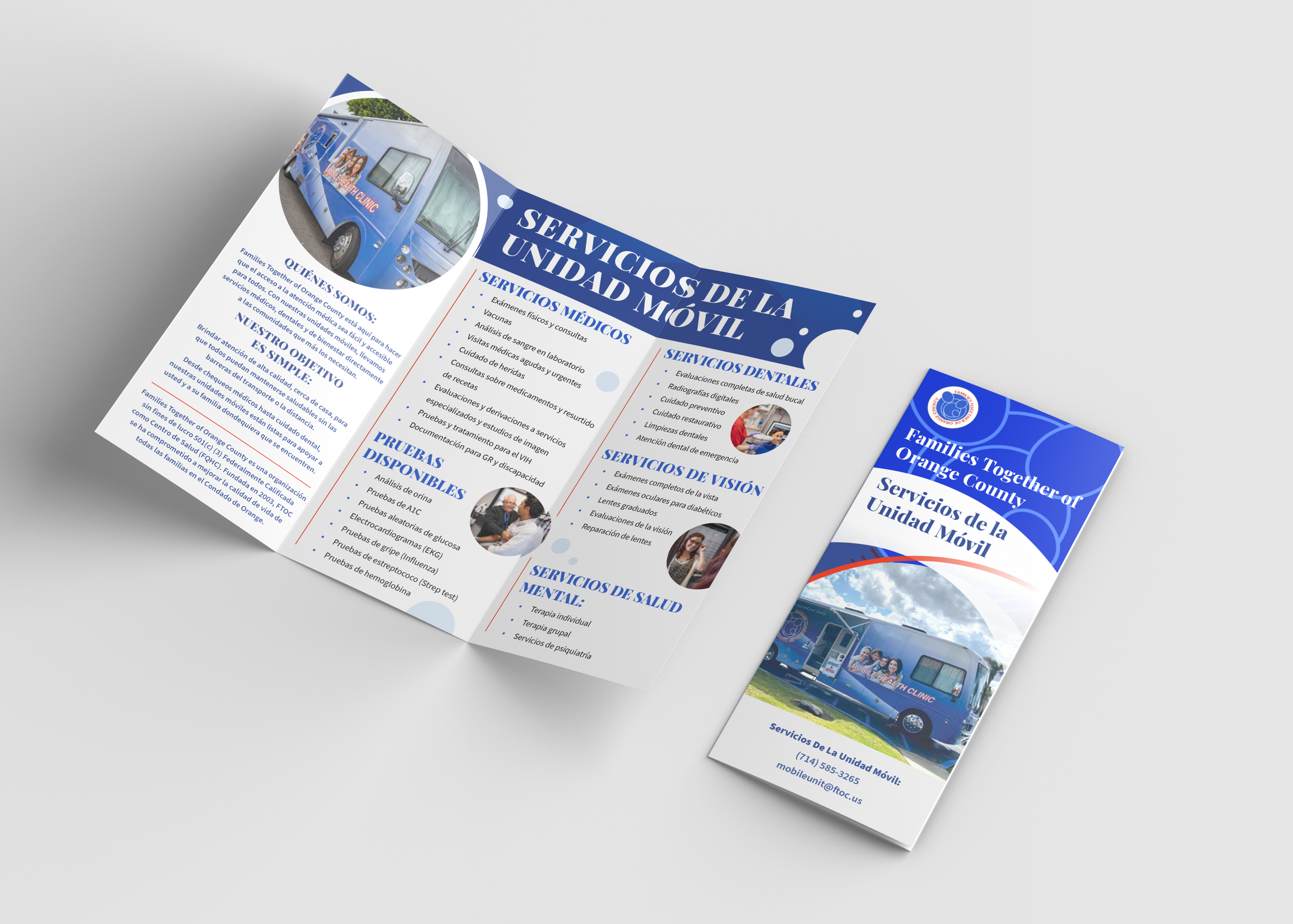 The 2025 Mobile Unit Services Brochure was developed to promote Families Together of Orange County’s mobile healthcare services across underserved communities. I designed a clear and community-centered brochure that outlined available medical, dental, vision, and behavioral health services, along with clinic locations and appointment information. Created in both English and Spanish, the brochure was widely distributed at community events, schools, churches, and directly to patients during mobile clinic visits—helping thousands of families learn about accessible care options. This piece played a key role in increasing awareness of free and low-cost healthcare services throughout Orange County.