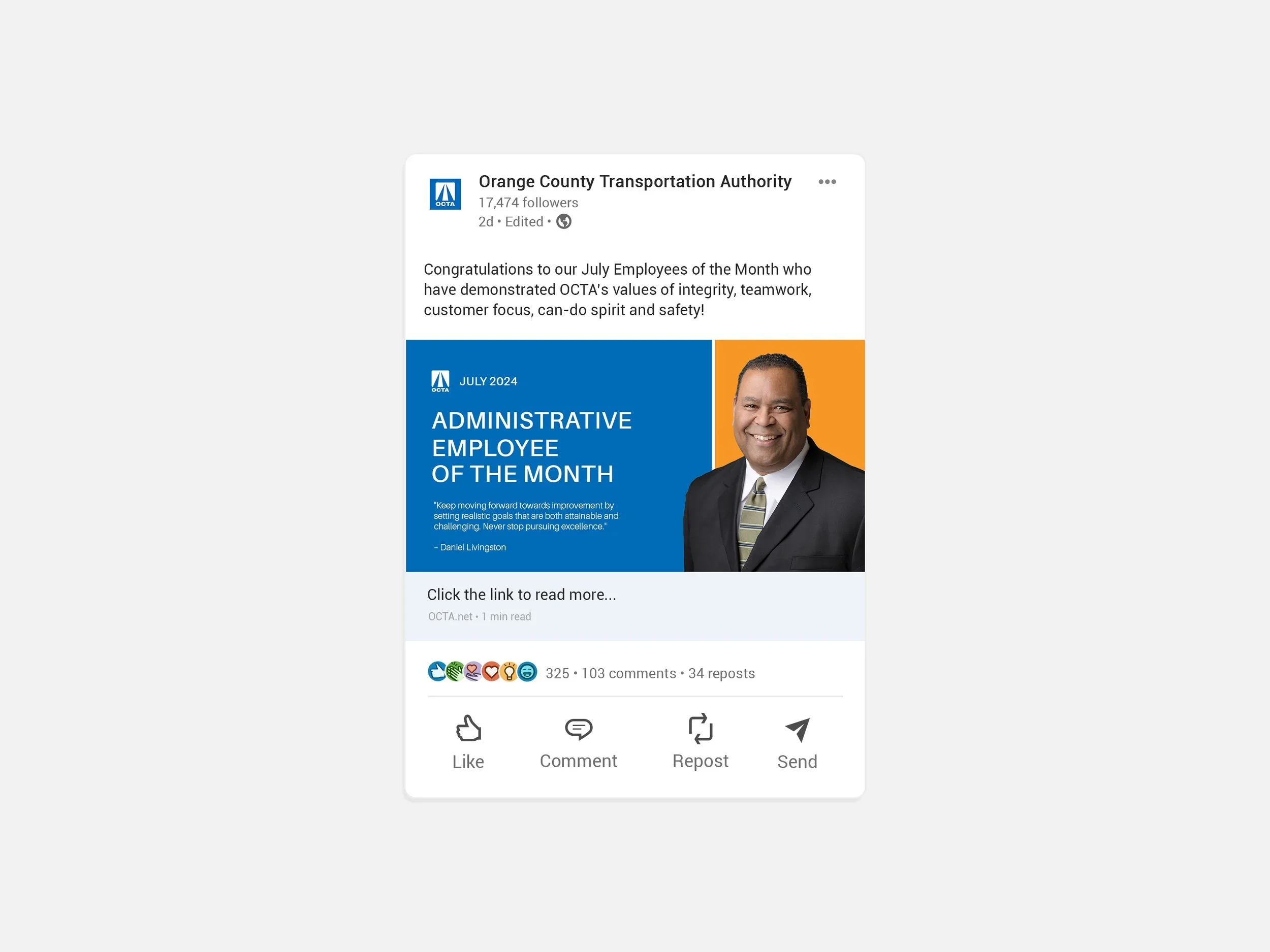 During my time at OCTA, I saw an opportunity to revamp the 'Employee of the Month' posts. The existing graphics template had been in use for quite a while, and I believed a fresh, bold design would not only refresh the look but also enhance engagement and draw more attention. My goal was to create a new visual identity that would make these posts stand out and better celebrate the achievements of our employees."