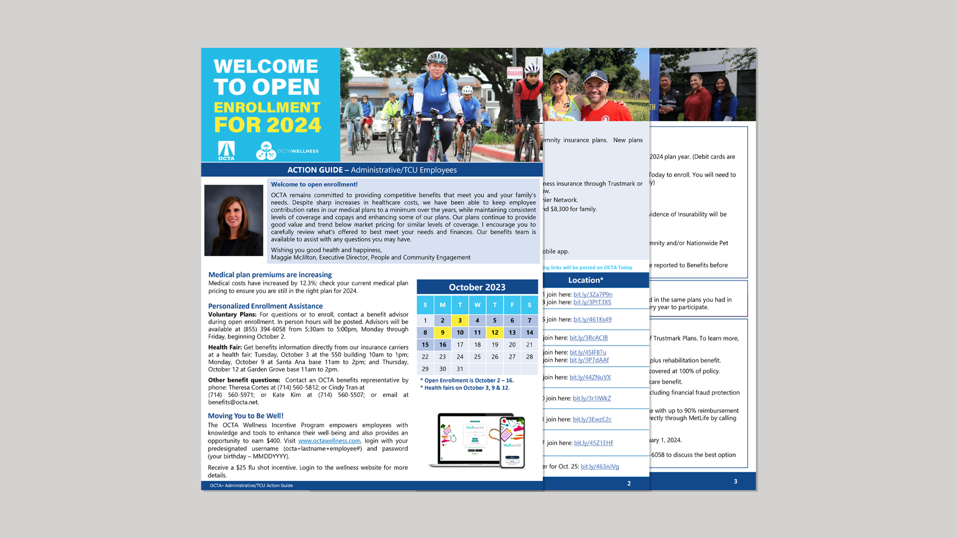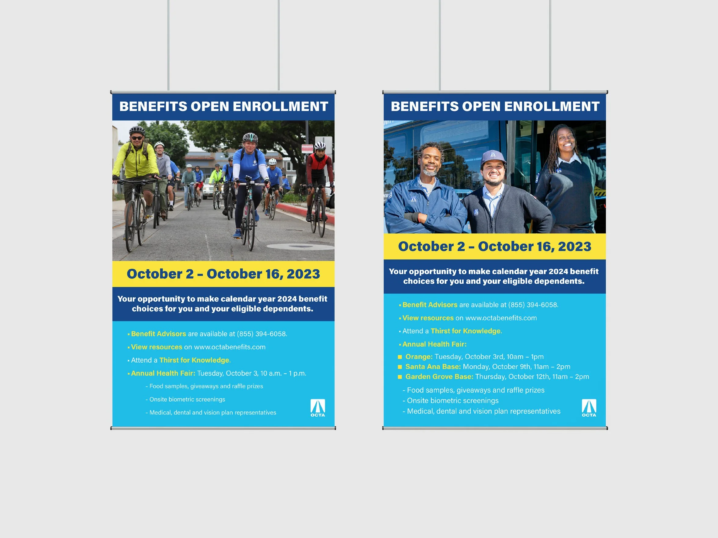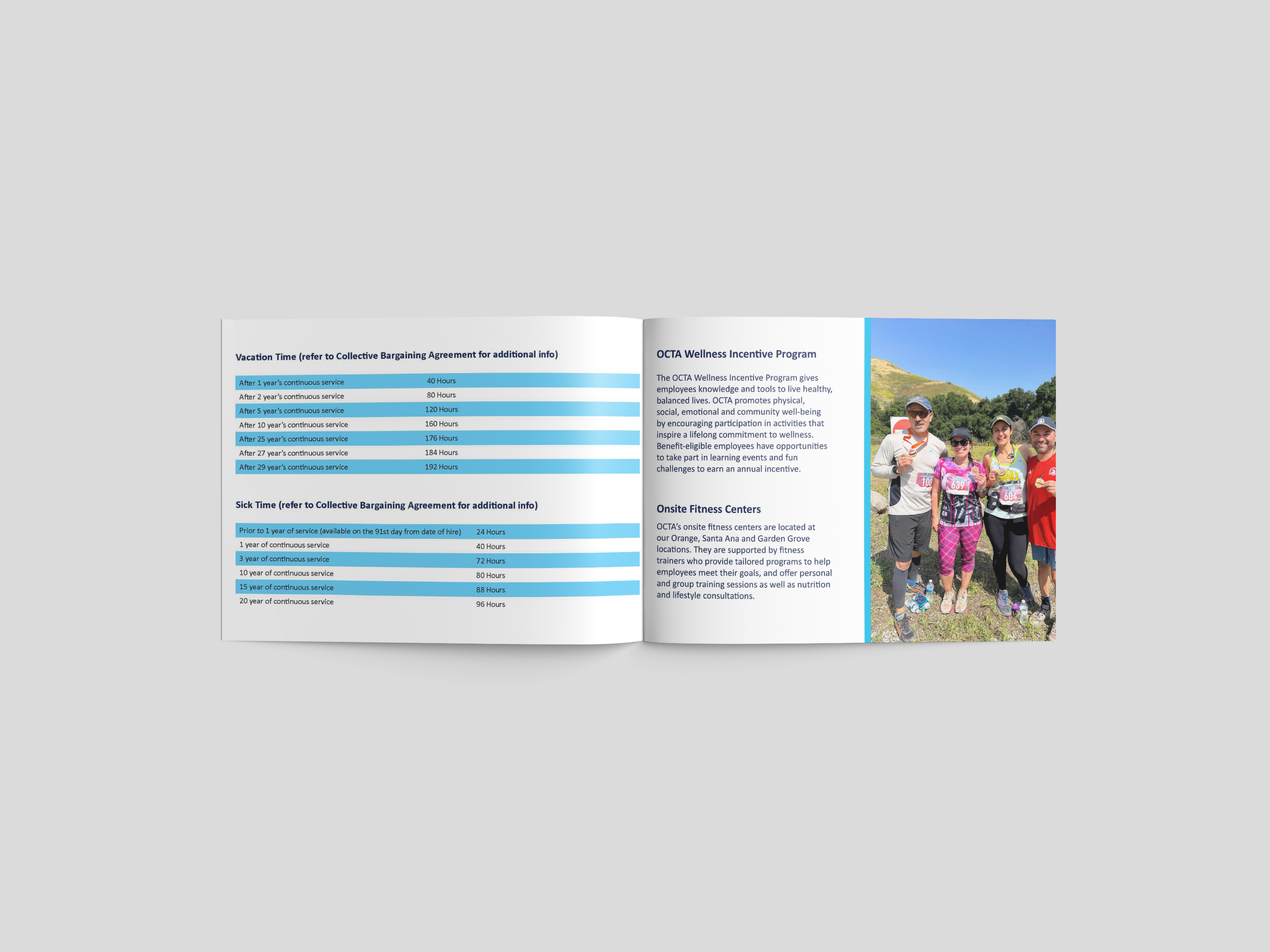 The Overview of Benefits brochure was developed to clearly communicate OCTA’s comprehensive benefits package to over 1,500 Coach Operators across the agency. I led the layout and visual strategy for this printed and distributed guide, transforming complex HR information into a clean, accessible, and easy-to-read resource. The booklet highlighted key areas such as medical, dental, and vision plans, paid time off, retirement contributions through OCERS, and voluntary benefits options—all organized in a structured, employee-friendly format. Working collaboratively with Human Resources and Communications teams, I ensured the final design emphasized clarity, trust, and inclusivity, making it easier for employees and their families to understand and navigate OCTA’s benefit offerings.